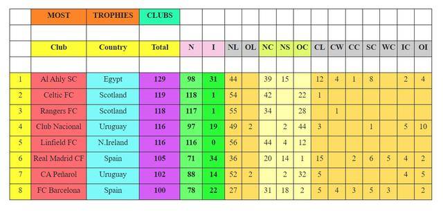 乌拉圭民族队获116冠,包括97个国内赛事冠军(49次联赛)和19个洲际赛事冠军。北爱尔兰林菲尔德同样116冠,全是国内赛事,联赛56次。