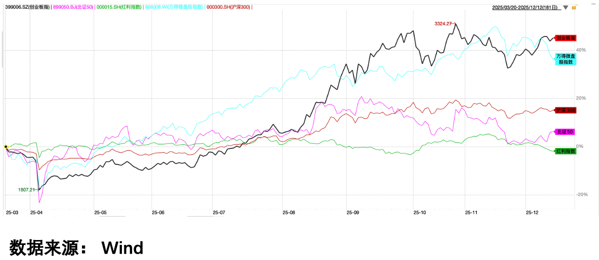 从今年4月开始的这波行情已经走了8个月,9月后变得特别折腾。很多人开始怀疑是不是行情到头了?要我说,这些人太年轻!这分明是典型的牛市蓄力阶段。看看这张图就明白:从北证到微盘股,再到创业板和红利股,领涨板块像走马灯一样轮换。