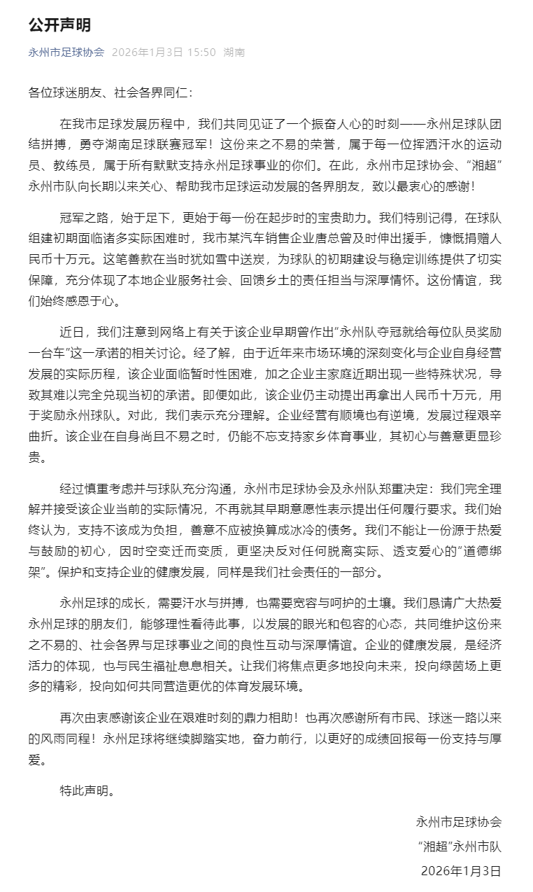 1月3日,永州市足球协会、“湘超”永州市队则发布公开声明,表示不再提出任何履行要求。